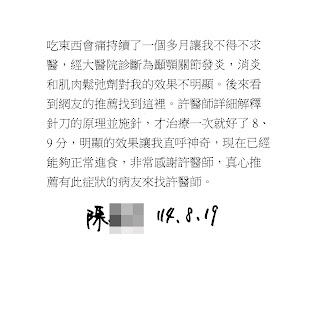 非常感謝許醫師的專業與用心,也誠心推薦給同樣有顳顎關節問題的病友。