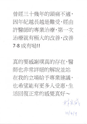 曾經三十幾年的頭痛不適,因年紀越長越是難受,經由許醫師的專業治療,第一次治療就有極大的改善,改善7-8成有呦!!